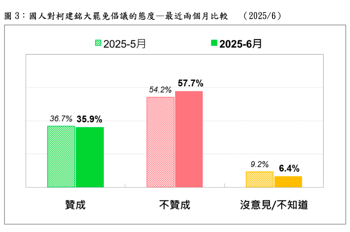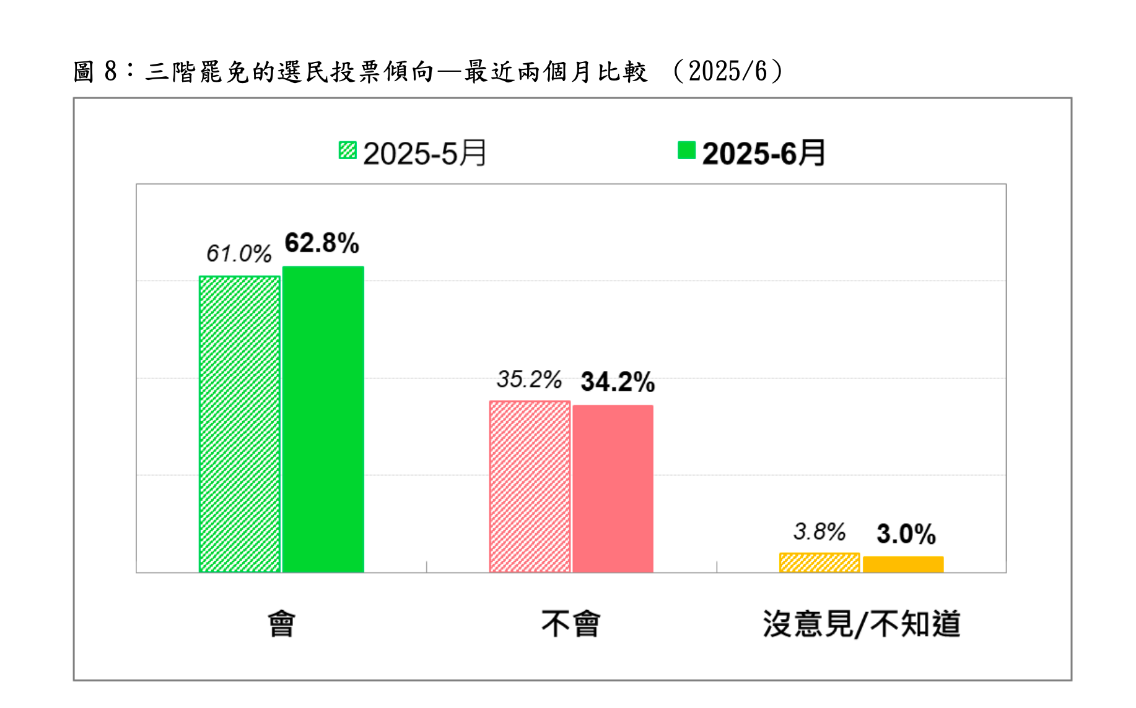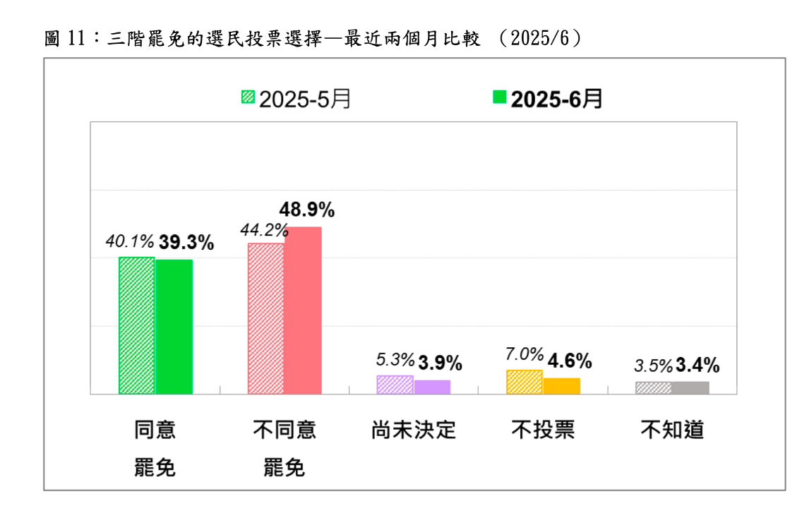 若明天投票,48.9%的受訪者表示會投反對罷免票,39.3%表示會支持罷免;未決定者為3.9%,另有4.6%表示不會投票,3.4%拒答或沒意見。這與上月相較,支持罷免者略減0.8個百分點,反對者則增加4.7個百分點,雙方差距擴大至9.6個百分點。