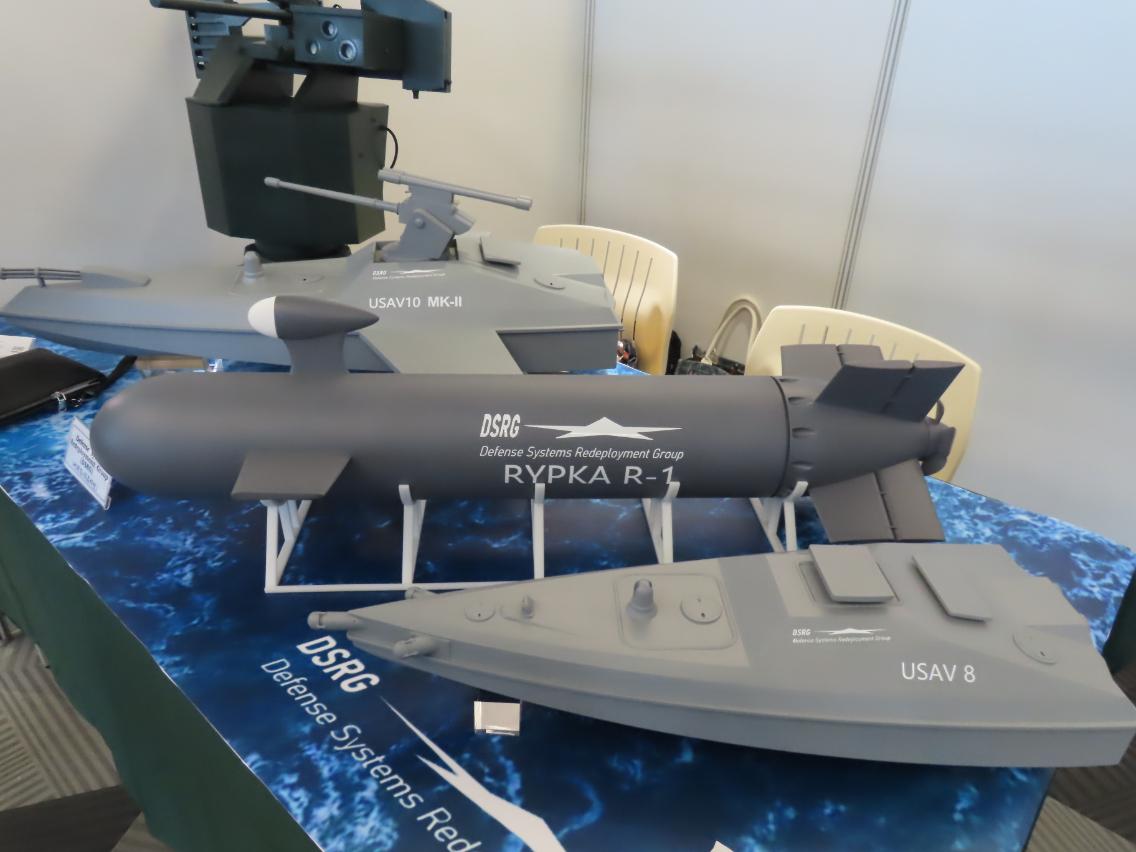 而在靜態展示現場,還有一家美商DSRG參展,所展示的產品,包括自殺式、攻擊式無人艇;以及衛星導航,可執行伏擊任務和回收的輕型魚雷,戰時更可突破共軍封鎖自水下運抵台灣。