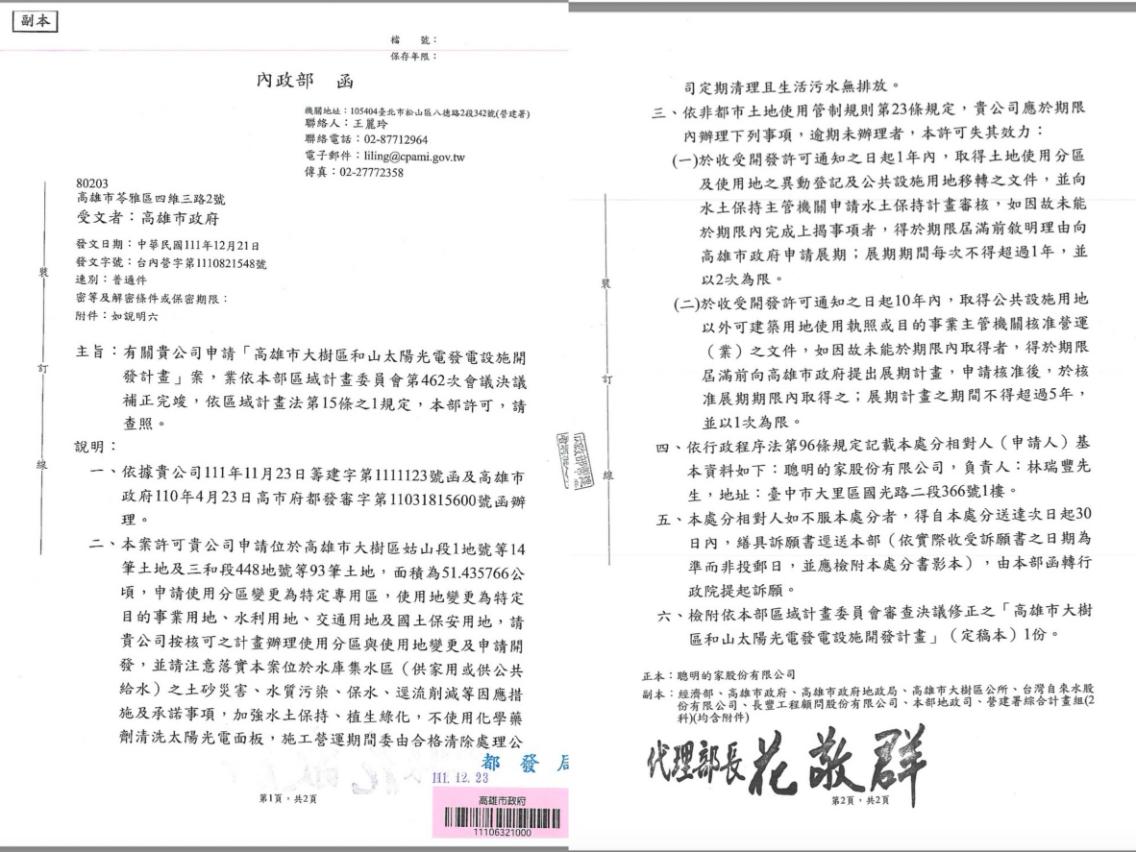 根據內政部在2022年12月21日發給高雄市政府經發局的核准函文得知,本案開發商是位於台中大里「聰明的家」,公司主要負責人為林瑞豐,林的事業主要在台中,旗下企業還有福慧生技。(資料來源/高雄經發局網站)