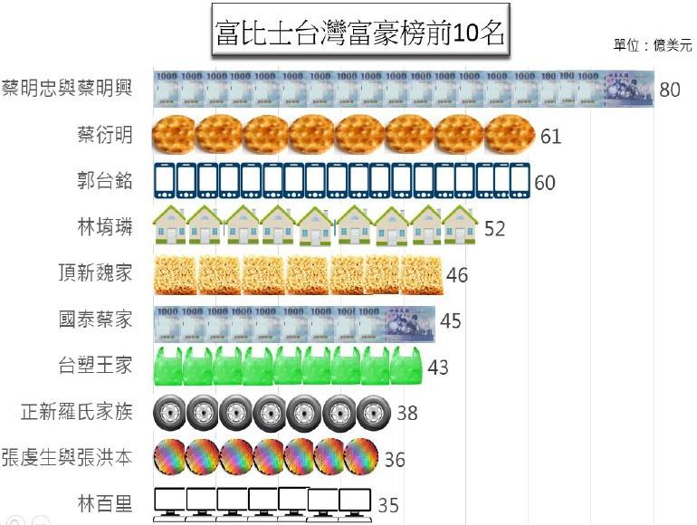 今年的台灣富豪排行榜,仍舊以富邦蔡家兩兄弟(蔡明忠與蔡明興)蟬聯冠軍寶座,不過兩人的資產淨值合計「只」剩下80億美元(約新台幣2,400億元),比去年足足減少20億美元(約新台幣600億元);而排名緊追在後的分別為旺旺集團蔡衍明的61億美元(約新台幣1,830億元),以及鴻海集團郭台銘的60億美元(約新台幣1,800億元),前者與去年的名次維持不變,至於郭董則是進步了一名。