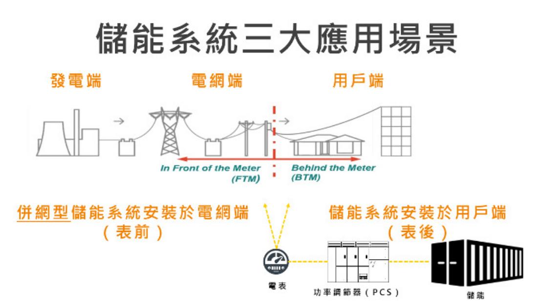 表前和表後的「表」,象徵的是台電的電表,是一種電力系統掌握與否的責任分界點。在發電端安裝的儲能例如光儲PV+ESS,以及403大地震的救援投手:電力交易平台上的輸電或配電級的儲能,都是電力系統可以看得到的資源,因此可以稱為表前儲能。在用戶端安裝的儲能,藏在負載端,電力系統看不到,也就掌握不了,稱為表後儲能。