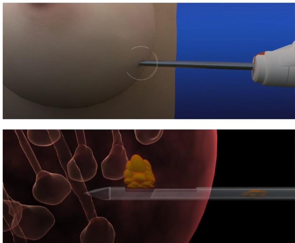 在乳房真空輔助微創手術中,醫師會利用超音波引導來確定腫瘤的位置,並在此引導下使用真空抽吸輔助針進行手術。首先,真空抽吸輔助針會吸住腫瘤,然後利用旋轉刀片逐步切除並抽取腫瘤,手術時間約為30分鐘。與傳統手術相比,乳房真空輔助微創手術能將外部傷口縮小至約0.3公分,僅為針孔大小,大幅降低手術的侵入性和疤痕大小。由於對組織造成的破壞較少,患者術後的疼痛較輕微,恢復時間較短,乳房變形的機會也較低。