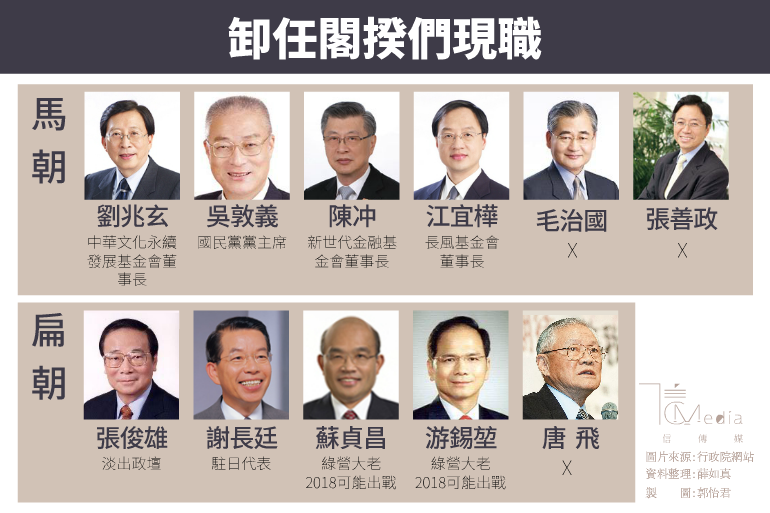 《信傳媒》昨日刊登了《從扁馬到蔡英文時代的林全 透視歷任閣揆大風吹》一文,整理了扁、馬政府歷任閣揆下台原因,雖然行政院留不住他們,但似乎也不代表他們政治生涯就這樣結束了,到底他們現在都在做什麼?