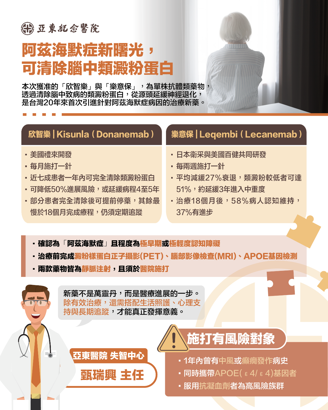 甄瑞興主任強調,兩款藥物皆為靜脈注射,且須於醫院施打;治療前完成澱粉樣蛋白正子攝影(PET)、腦部影像檢查(MRI)與APOE基因檢測等評估。臨床數據顯示,極少數患者可能出現腦水腫或點狀出血,須搭配影像監測,以確保療程安全。