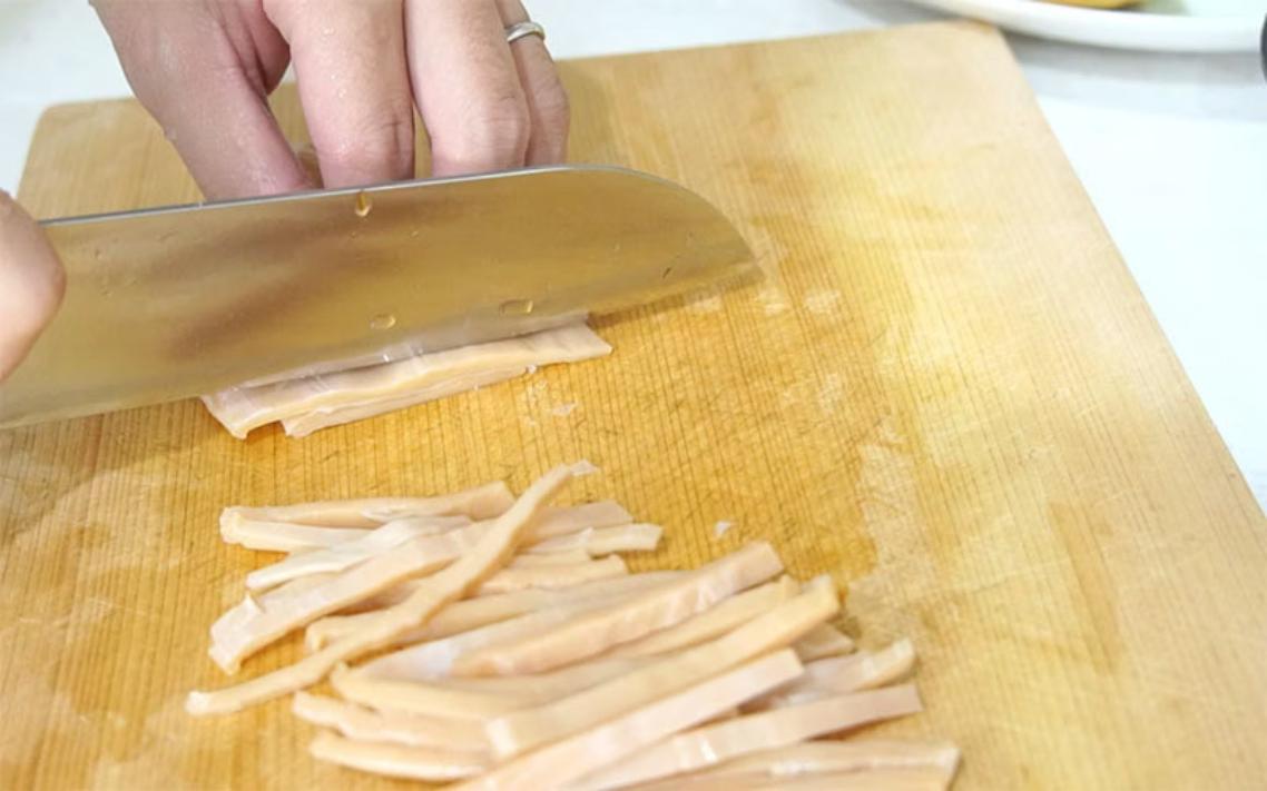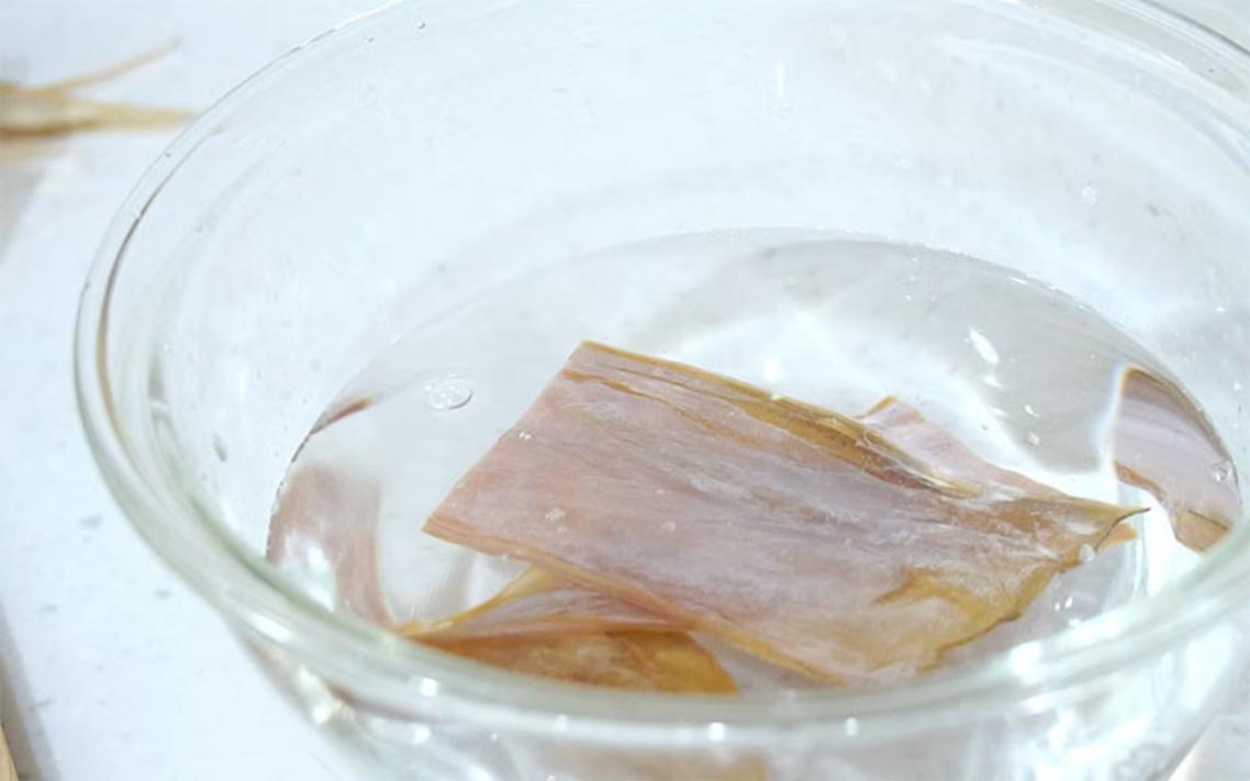 乾魷魚需要長時間泡水泡開,前一晚就要先將乾魷魚泡水,這樣隔天製作才能使用喔。