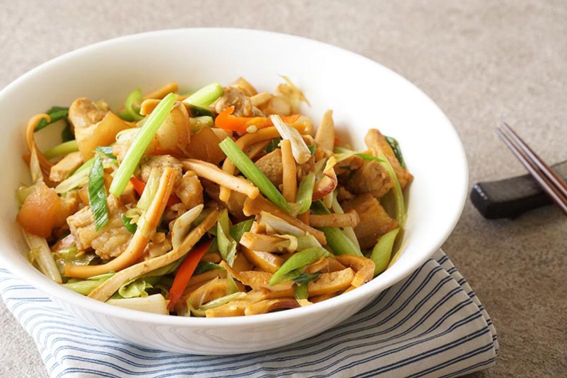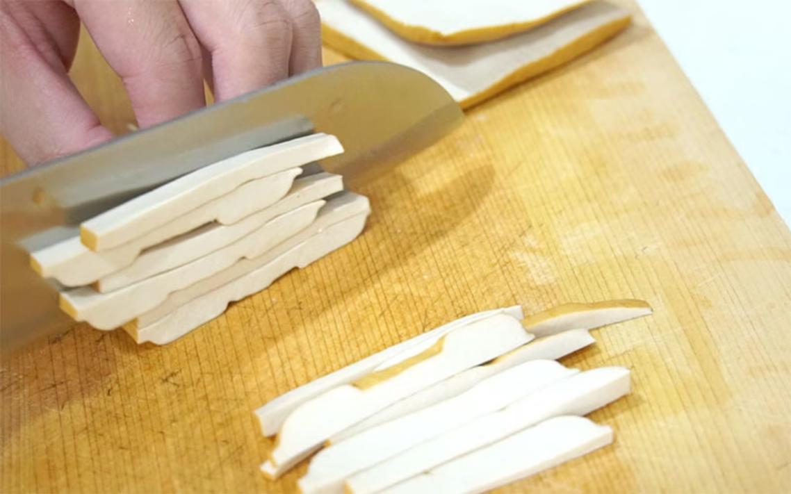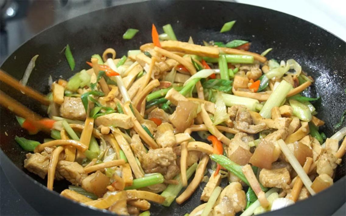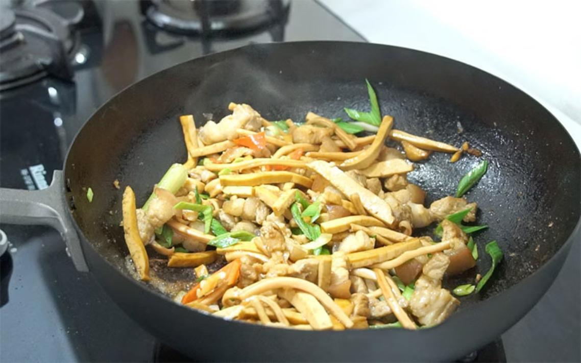 接著加入豆乾一起拌炒,豆乾能夠稍微上色也能增添料理香氣。接著加入水約100c.c.,大火收汁。這個過程能逼出豬油,讓味道融合。