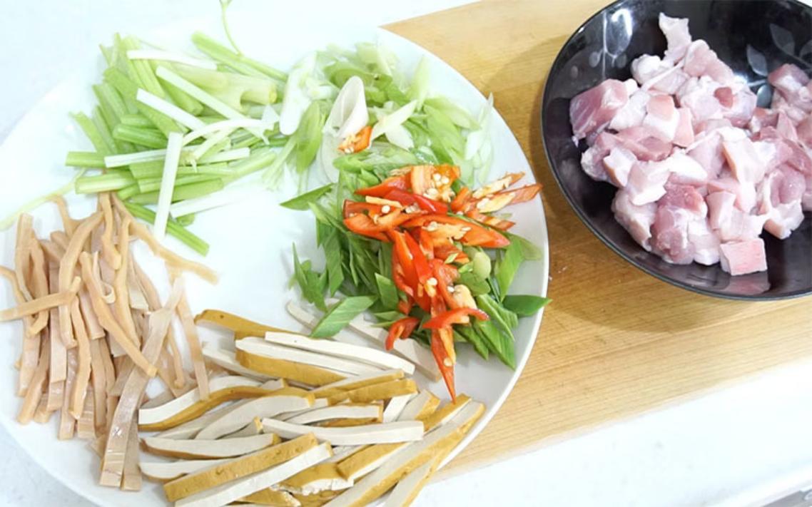 客家小炒一大重點就是備料,原則是盡量讓每種食材等長或大小盡量一致: