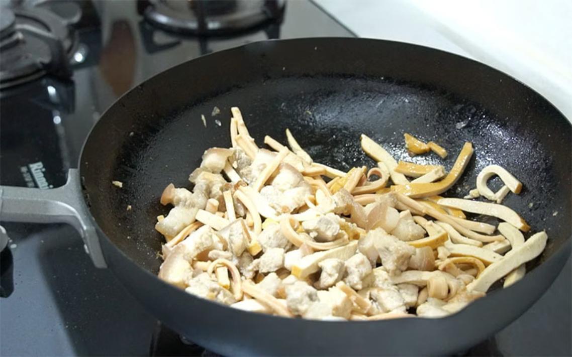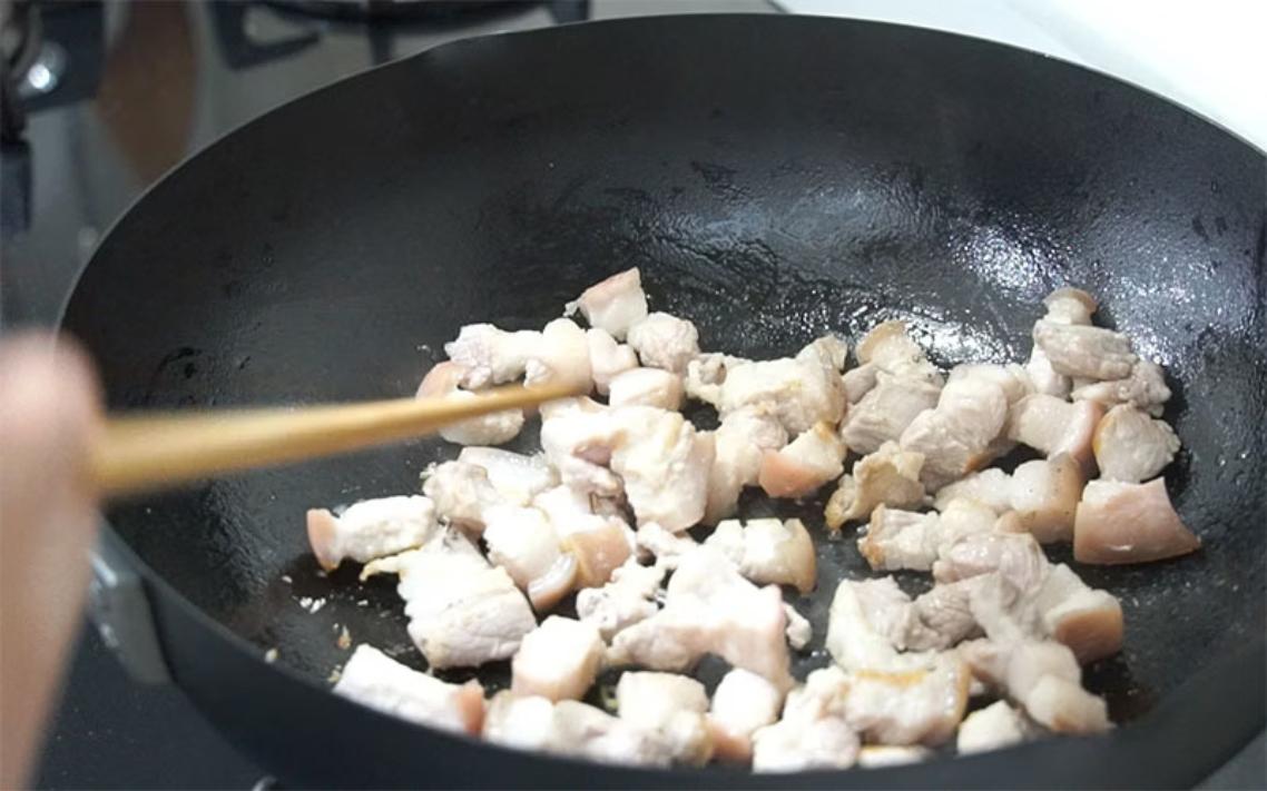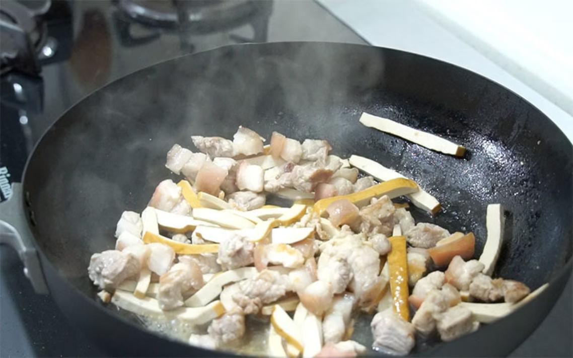 熱鍋熱油後,先將豬肉下鍋炒熟並些微上色。