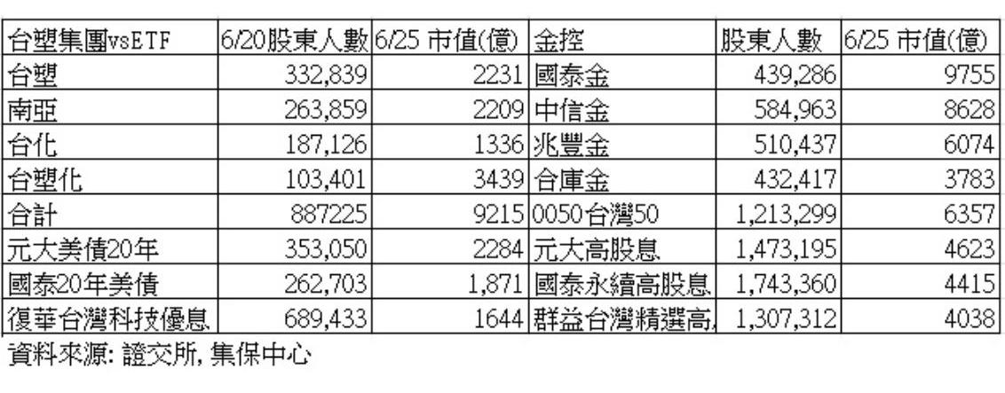 台塑集團單一公司市值與股東人數,比前排在50大市值中的0050、元大高股息、國泰高股息這類ETF還少,規模和元大美債20年這類的ETF差不多,台塑公司本身是否會跌出台灣50成分股,某位金控高層回應,「也許有一點可能,但觀察期間超過1季,除非台塑跌幅超過大盤太多,否則,還能在榜上一段很長的時間。」