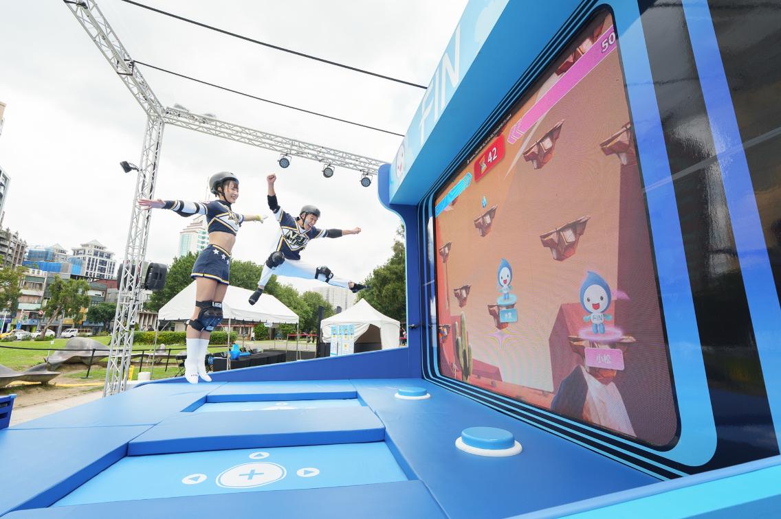黑松FIN將經典遊戲機台放大8倍,讓玩家原地化身「真人遊戲搖桿」,跳躍操控遊戲內的「FIN水寶」。(圖片來源/黑松)