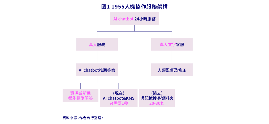 1955勞動諮詢與申訴專線工作人員48人,約93%身心障礙者,其中35%為視覺障礙者,22%為中高齡者。為提升服務效能並實現AI與身心障礙者協作的最佳分工模式,設計以下服務架構: