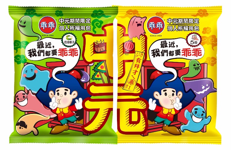 中元普渡剛過,家家戶戶、公司行號一定都還堆放著為了因應中元節而準備的零食、泡麵。你是否有發現乖乖、可樂果這些經濟又實惠的最熱門老牌零嘴都換了新衣呢?抓住中元節大採購商機,乖乖公司ㄧ改先前的老字號包裝,推出乖乖「個人祈福包」,包裝上的乖乖公仔嘟起嘴提醒消費者,最近好兄弟放行「我們都要乖乖」,還放上了Q版的好兄弟,要大小朋友「有拜才ㄟ乖」。