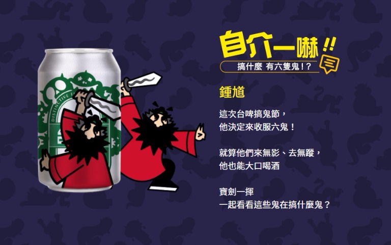 台灣菸酒公司旗下的台灣啤酒也不落人後,推出「搞鬼啤酒」來打這場農曆七月搞鬼大戰。台啤與設計舉牌小人的知名設計師李翰合作,結合台啤的綠色酒標,讓貪吃鬼、膽小鬼、愛哭鬼、懶惰鬼、小氣鬼、開心鬼等6隻小鬼吃掉酒標、攤在酒標上。除了這6隻顯露人們本性的小鬼外,還另外推出鍾馗啤酒,要他大刀ㄧ揮,劈開你的6種惰性,堪稱老闆專用酒瓶。