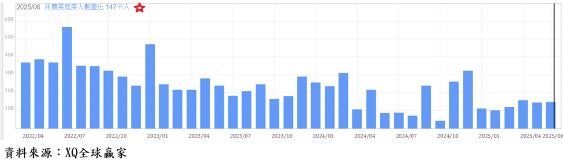 美國6月非農就業人口新增 14.7萬人,高於市場預期的11.1萬人,但5月新增非農業就業人口從13.9萬人上修至14.4萬人。6月失業率4.1%,低於市場預期的4.3%與5月的4.2%。6月新增非農就業人口雖高於市場預期,但過去6個月每月新增非農就業人口均低於15萬人,顯示新增非農就業人口數出現成長停滯現象,隱含就業市場可能成長乏力。
