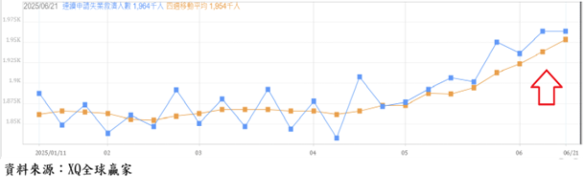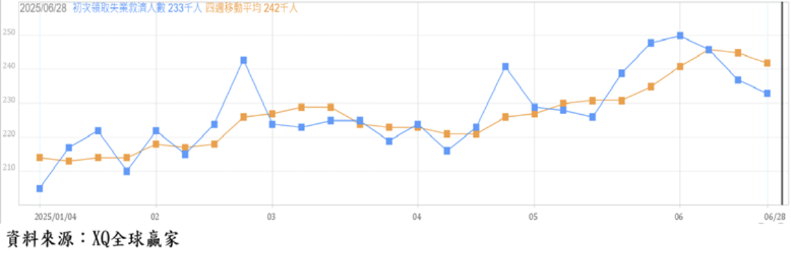 截至6月28日止的美國單周初領失業救濟金人數從前周的23.7萬人下降至23.3萬人,初領失業救濟金四周移動平均自前周的24.5萬人,下降至24.2萬人,但依舊維持在2024年10月後的最高點附近,雖仍為長期相對低檔區,但隱含短期就業市場出現鬆動徵兆。