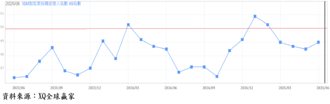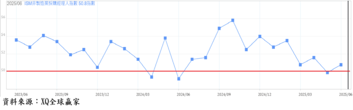 美國6月ISM服務業指數自5月的49.9的過去11月的最低點,小幅回升至50.8,依舊在景氣擴張與收縮臨界點50附近,顯示美國服務業轉弱危機並未完全解除。服務業佔美國整體GDP比重超過八成,川普祭出高關稅政策,引發消費者信心大跌,可能影響服務業景氣的穩定擴張,成為美國總體經濟可能持續陷入衰退的重要因素,展望Fed貨幣政策,2025年第三季末重新起啟動降息循環的機率仍高。