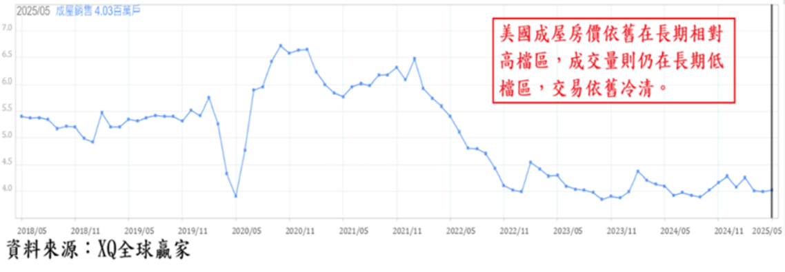 2025年5月美國成屋年率銷售戶數403萬戶,較4月微幅增加0.75%,年減1.95%,連續4個月負成長,成交量持續低迷,仍處於銷售年率戶數低於450萬戶的長期谷底區。5月成屋房價中位數42.28萬美元,較4月上漲2.1%。2024年6月創下42.69萬美元的歷史最高點,截至2025年5月,累積跌幅僅0.96%,房價依舊在長期相對高檔區,成交量則仍在長期低檔區、交易依舊冷清。