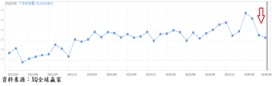 6月汽車年率銷售量為1530萬輛,連續3個月下降,年增率從5月的年減1.83%,上升至6月的2.06%,川普擬對各國進口至美國的車子,大幅提高進口關稅,對市場產生提前消費的效應,導致美國3月、4月的汽車銷售量突然激增,隨消費者信心指數陡降,提前購車熱潮消退,單月汽車銷售連續第3個月下降,美國車市後市恐怕不樂觀。