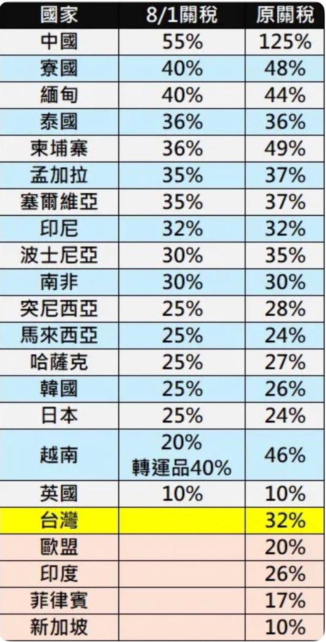 這波關稅將從8月1日起開徵,與川普4月2日「解放日」關稅大致差不多。其中,南韓、泰國、印尼都不變,依序為25%、36%、32%,南非也持平於30%,日本和馬來西亞從24%調升至25%,緬甸、寮國最高均為40%,柬埔寨36%,塞爾維亞和孟加拉均為35%,另外,馬來西亞、突尼西亞與哈薩克為25%。