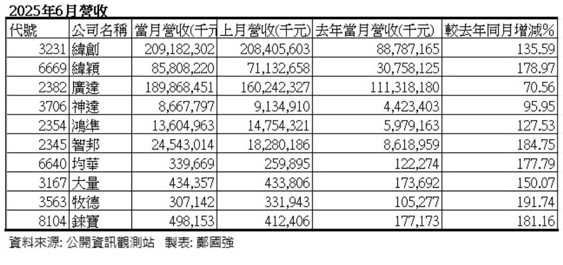 上市公司陸續公布6月營收數字,截至9日已公布營收的電子股中,營收較去年6月成長超過100%、單月營收又超過20億元就有緯創、緯穎、神達、鴻準和智邦。
