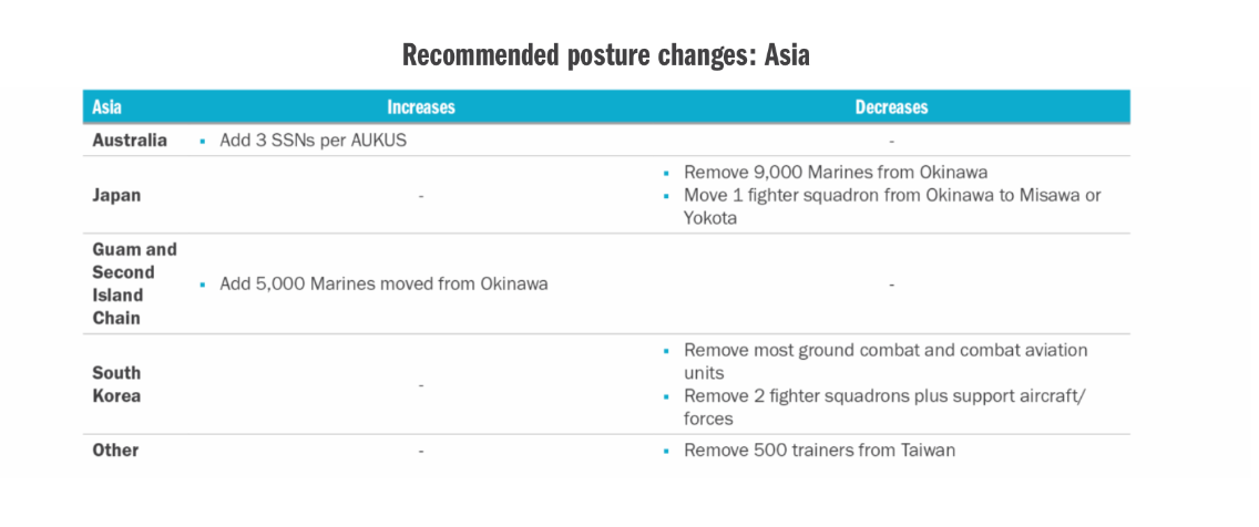 對於歐洲與中東地區,報告建議大幅後撤回冷戰及反恐時期留下的兵力。而對於印太地區,該報告提出的評估與建議顯得尤為深具爭議性,特別考慮到台灣的戰略地位和中美緊張關係。