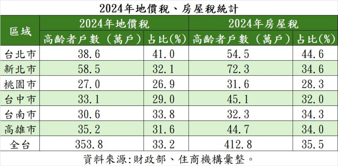 根據財政部數據,2024年房屋稅高齡納稅人達413萬戶,占全體納稅人比率35.5%創新高;其中,觀察六都數據,台北市2024年所有屋主中,有44.6%年齡超過65歲,占比冠居全台。另據地價稅統計,2024年地價稅高齡納稅人也達354萬戶,占全體納稅人比率達33.2%;其中,台北市2024年所有繳納地價稅者,也有41%的地主為高齡者,同樣占比是全台最高。
