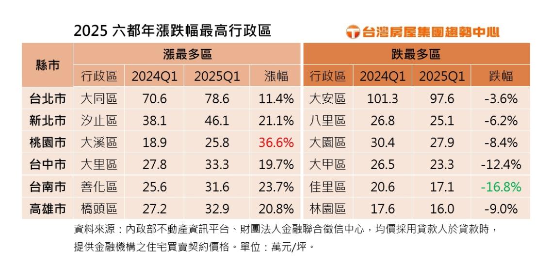 台灣房屋集團趨勢中心根據內政部不動產資訊平台資料,觀察六都當中各行政區漲跌幅最高的行政區,以桃園市大溪區年漲幅36.6%居冠,從去年平均每坪18.9萬元,攀升至今年25.8萬元; 台南市善化區和新北市汐止區,年漲幅也超過兩成。漲最少的是台北市大同區,也有11%的增幅。