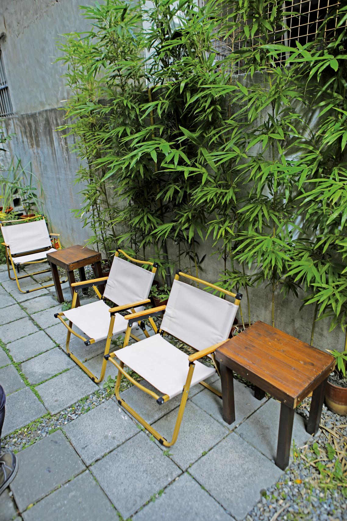 咖啡屋的室外矮牆與主建築之間有一條狹長走道,延伸到屋後,形成一處微形戶外庭園區。碎石地板、原木方桌、帆布扶手椅,融入在細長竹子與虎尾蘭植栽風景之間。坐在這裡,披一肩從竹葉間灑落的日光碎片,就著大肚山午後清風,一口咖啡滑入舌尖,煩悶的心情頓時舒展開來。