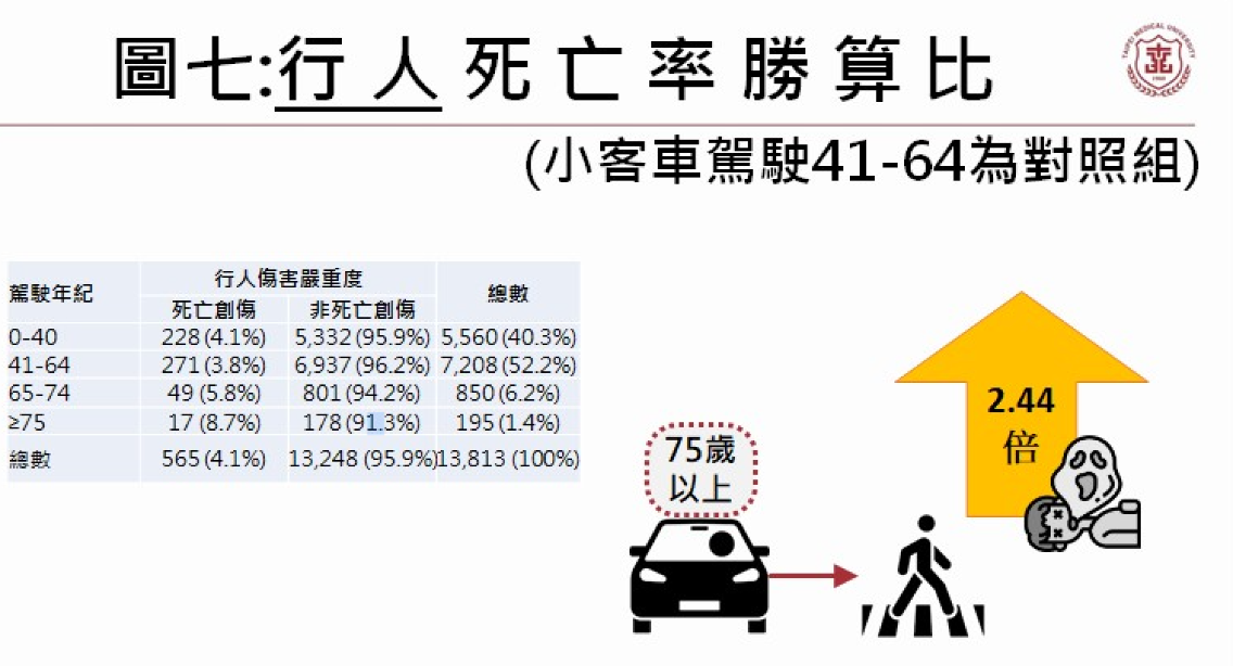 北醫大公共衛生學院傷害防治研究所白志偉教授團隊,根據警政署2011年至2023年汽車交通事故資料庫,分析超過42萬6千起事故案例。其中,41至64歲為主體駕駛人,達22萬3,303人,而75歲以上駕駛人為6,166人。儘管比例不高,卻是最具風險的族群。白志偉指出,隨著年齡增加,駕駛人對行人造成的死亡風險也隨之攀升。65歲後,每增1歲,行人死亡風險增加4.5%;75歲後則飆升至11.3%。