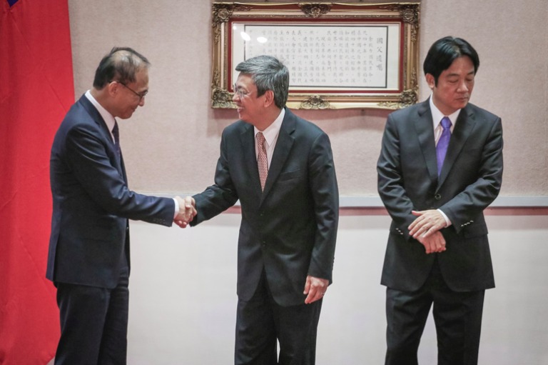 賴清德和原金管會主委李瑞倉握手,並主持交接給顧立雄。