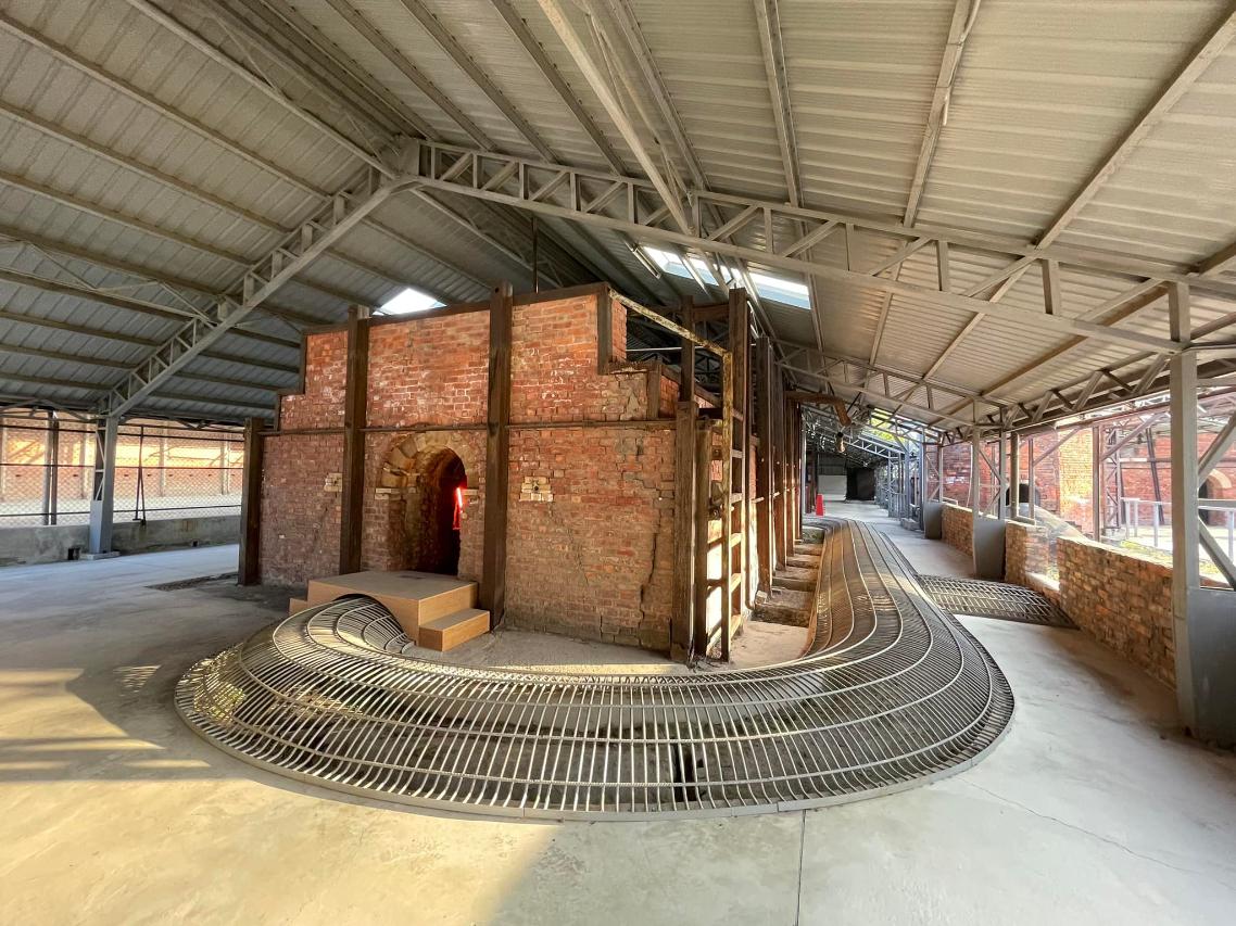 磚窯廠的業績長紅,對外招募更多作業人員,並且擴大編制,從唐榮鐵工廠三級廠升為二級廠,以耐火磚為主力商品。1978年底,磚窯廠改名耐火材料廠(圖11),為擴大銷售規模,派員赴國外考察,汲取各國經驗後打造隧道窯(圖12),窯體分為預熱帶、燒成帶、冷卻帶,設有軌道(圖13)、臺車輸送,機械化的生產模式,有效節省人力,每當接到大量訂單時,還能夜以繼日延長生產線的作業時間。
