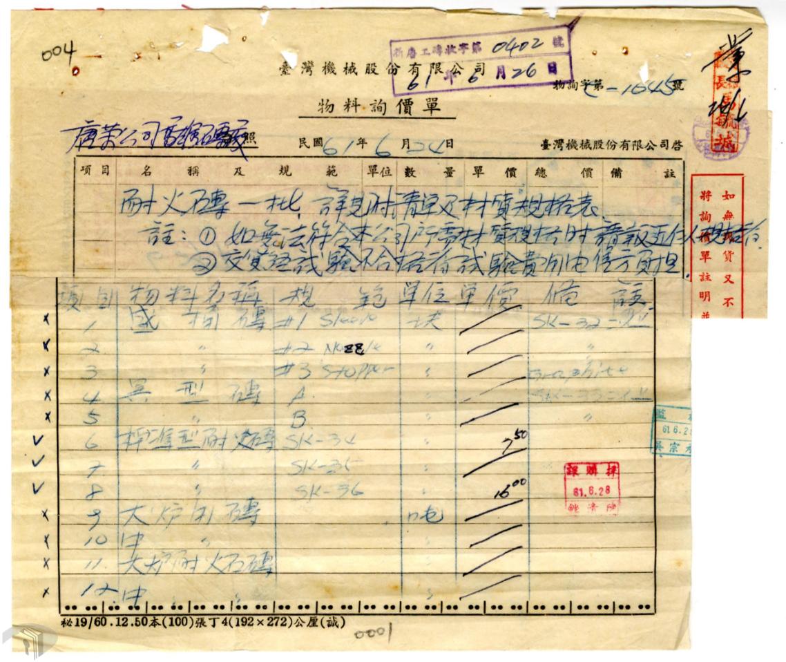 磚窯廠生產的耐火磚提供唐榮鐵工廠使用外,也深受臺灣機械股份有限公司(圖9)等企業的青睞,尤其1970年代初期正值臺灣推動十大建設,設置大煉鋼廠,以及各地鋼鐵廠加速鍛煉鋼材,對高耐熱磚材的需求量大增,致使磚窯廠不斷透過國際交流提高生產技術,同時興建多座倒焰窯、添購新設備,以提升生產效能(圖10)。