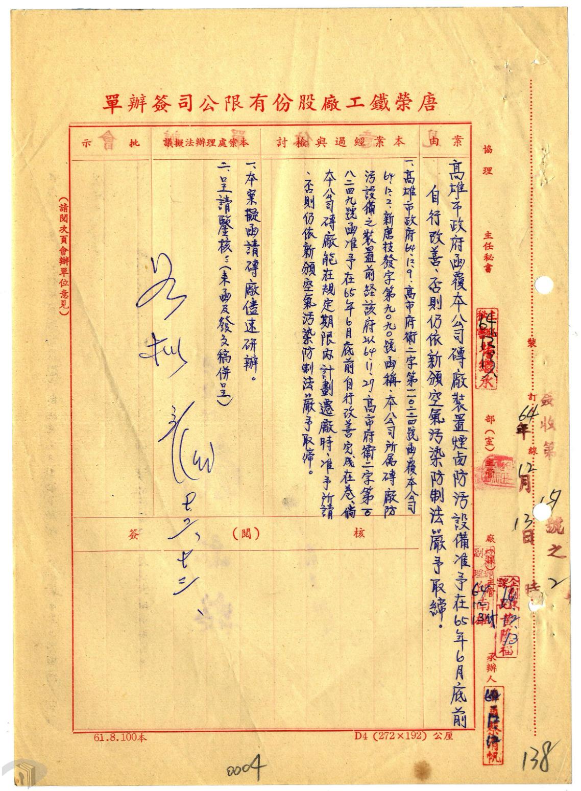 雖然磚窯廠轉型生產耐火磚帶來榮景,與此同時也面臨許多新問題。內部方面,許多設備老舊,加上環境衛生、勞工安全檢核多次未能過關,屢次遭到高雄市政府要求限期改善。至於外部的問題,則是產製大量耐火磚時,造成嚴重的空氣污染,危及鄰近民眾生活品質(圖14);另一方面,磚窯廠位在市區,隨著都市計畫的發展,不適合再充作工業產能,致使許多輿論認為應該將磚窯廠變更為住宅商業區,重新進行規劃。內外難題交迫下,磚窯廠一度擇選小港沿海、仁武、大社或楠梓加工出口區,作為新廠房遷建的地點。