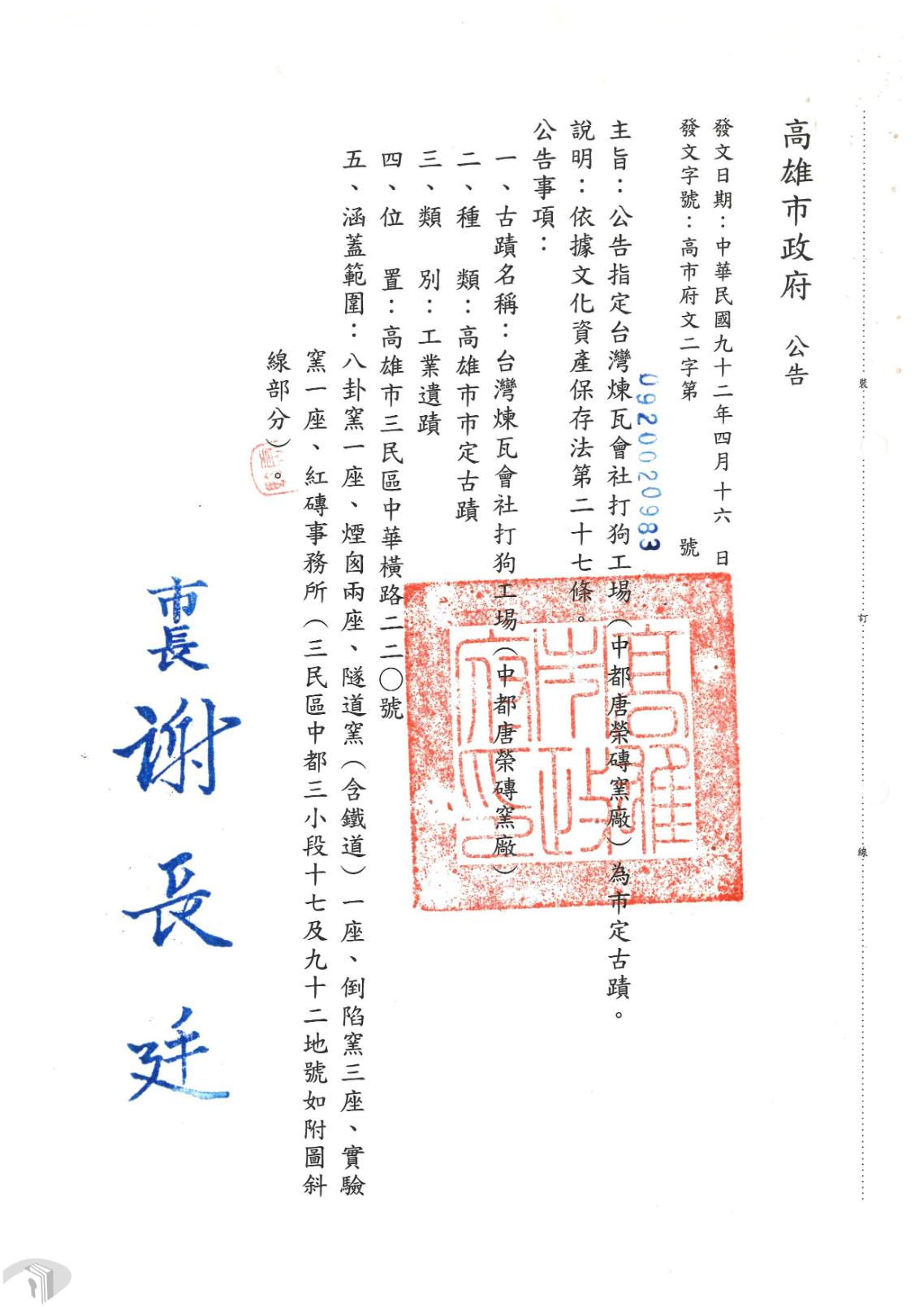 1980年代初期,唐榮鐵工廠精簡組織,磚窯廠併入中興不銹鋼廠,卻面臨耐火磚市場蕭條,以及同業之間劇烈競價,不久之後決定停止燒製耐火磚。1992年,唐榮鐵工廠配合臺灣省政府虛級化政策,調整組織改隸經濟部,成為公營事業。2002年,磚窯廠面臨公營事業民營化浪潮,考量環保意識抬頭及工資高漲等因素,決定關閉廠房,資遣安置全部員工。近年來,隨著國人對文化資產的重視,位在高雄市中都地區的唐榮磚窯廠經專家勘查,被列為高雄市市定古蹟(圖15)、歷史建築,後來「中都唐榮磚窯廠」被認定為國定古蹟(圖16),成為高雄工業文化遺址。