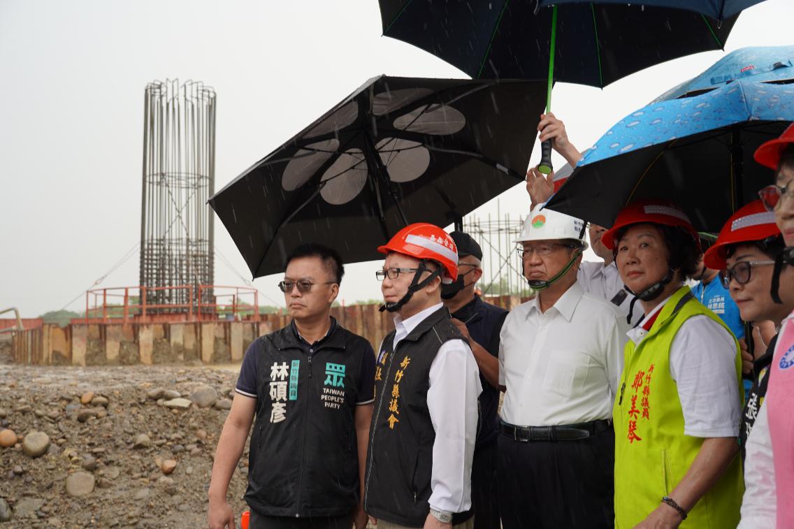 楊文科表示,今天冒雨視察台一線替代道路工程,這項工程全長約1.7公里,其中812公尺為橋梁、939公尺為道路,最長橋樑為跨越頭前溪的跨河大橋,長度約340公尺,預計興建4座橋梁,目前工程進度順利且超前,在施工完成後,有望紓解竹北、新豐、湖口地區的交通。