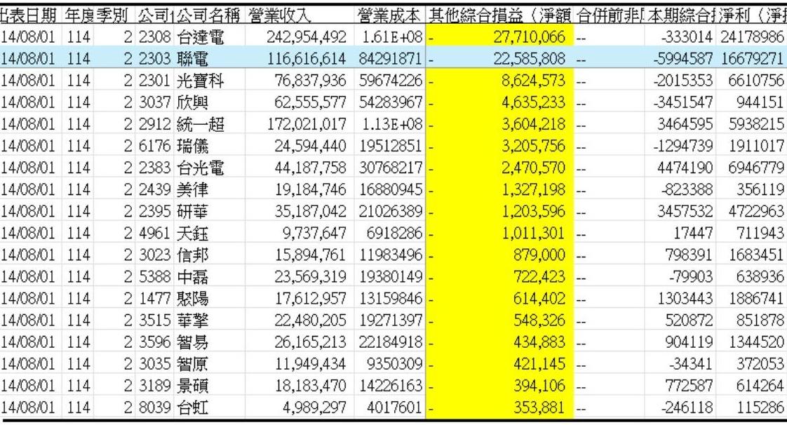 根據公開資訊觀測站已公布的各家上市櫃公司財報排列,累計至第二季(即上半年)「其他綜合損益(淨額)」數字虧損最大是台達電的277.1億元,這裡面可能涵蓋匯損與其他損失,聯電是負225億元、光寶科虧86.2億、欣興虧46.3億元、統一超虧36億元,都是排名前幾大,反映台幣升級衝擊程度。