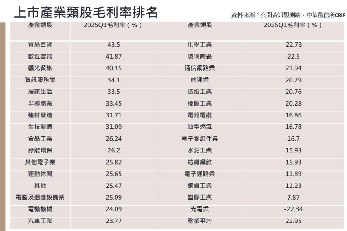 就各別產業來看,今年第1季平均毛利率高於25%的產業類別僅有14個類別,分別是貿易百貨、數位雲端、觀光餐旅、資訊服務、居家生活、半導體業、建材營造、生技醫療、食品工業、綠能環保、其他電子、運動休閒、其他類、電腦及週邊設備。