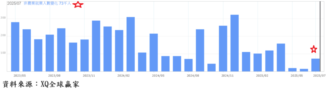 美國7月非農就業人口新增 7.3萬人,遠低於市場預期的10.4萬人,下修前2月新增非農業就業人口高達26萬人,5月新增1.9萬人、6月新增1.4萬人,導致近三個月平均新增就業人數僅3.5萬人,市場預期Fed於九月重新啟動降息的機率跳升至九成。7月失業率從6月的4.1%,上升至7月的4.2%,與市場預期的4.2%相符。7月的非農就業報告,顯示新增非農就業人口數出現成長停滯現象,隱含就業市場可能成長乏力。