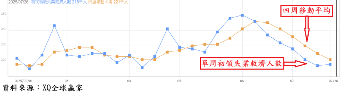 截至7月26日止的美國單周初領失業救濟金人數從前周的21.7萬人微幅上升至21.8萬人,初領失業救濟金四周移動平均自前周的22.5萬人,下降至22.1萬人,仍為長期相對低檔區,顯示短期就業市場數據仍維持穩定狀態。