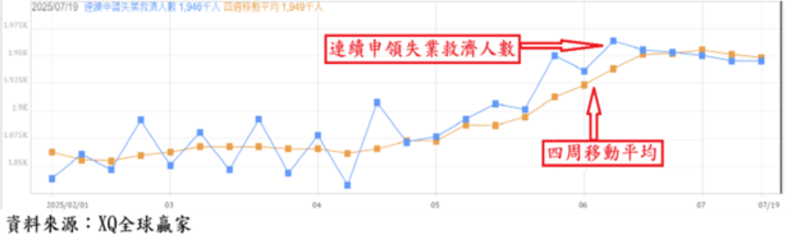 連續請領失業救濟金人數自前周的194.6萬人,與前周持平,連續請領失業救濟金的四周移動平均,自前周的195.2萬人,微幅下降至194.9萬人,連續2周微幅下降,仍為2021年12月後的最高附近,顯示長期失業人口潛藏上升危機,尚未解除,隱含就業市場單周初領失業救濟金人數,表面上看似穩定,但長期連續申領失業救濟金人數,實則穩中帶弱,就業市場存在轉弱風險。