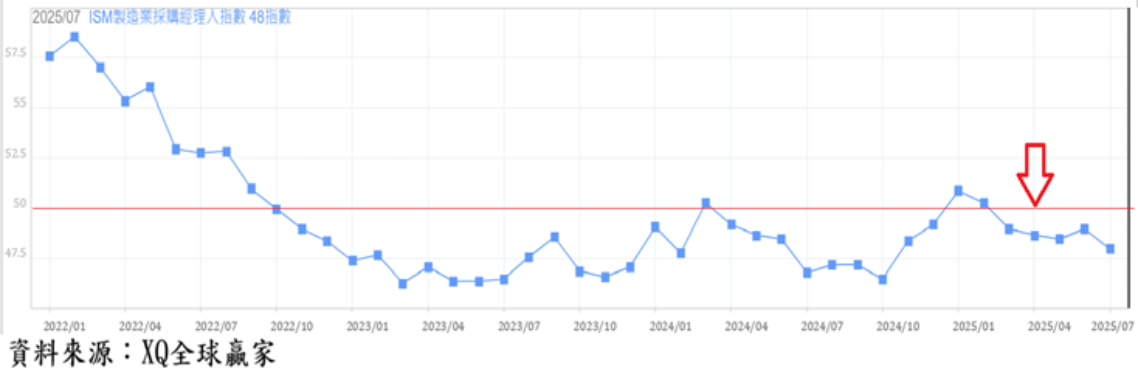 美國7月ISM製造業採購經理人指數自6月的49,下降至48,連續五個月低於代表景氣擴張與收縮臨界點50以下,顯示美國製造業景氣仍處於收縮狀態。對照6月生產者物價指數年增率自5月的2.8%,下降至2.4%,創過去9個月最低,顯示製造業景氣狀態仍相當薄弱。