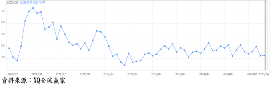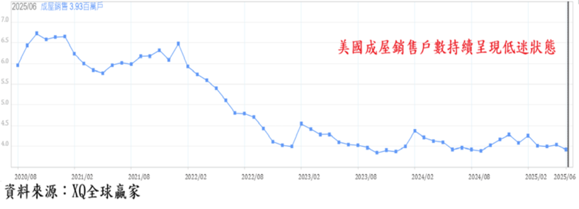 2025年6月美國成屋年率銷售戶數393萬戶,月減2.72%,創2024年8月後的最低點,與2024年同期持平,成交量持續低迷。6月成屋房價中位數43.53萬美元,較5月上漲2.7%,突破2024年6月創下42.69萬美元的前次歷史最高點。房價依舊在長期高檔區,成交量則仍在長期低檔區、交易依舊冷清。