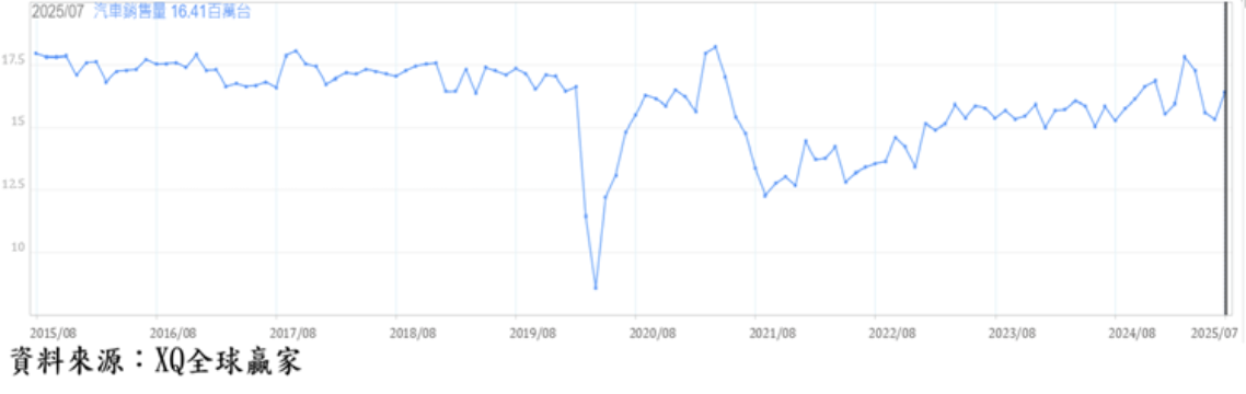 美國7月汽車年率銷售量為1640萬輛,連續3個月下降後,首度反彈,年增率從6月的年減1.93%,上升至7月的3.53%,川普擬對各國進口至美國的車子,大幅提高進口關稅,對市場產生提前消費的效應,導致美國3月、4月的汽車銷售量突然激增,隨消費者信心指數陡降,提前購車熱潮消退,汽車銷售量恢復正常,美國車市成長停滯狀態似未改變。