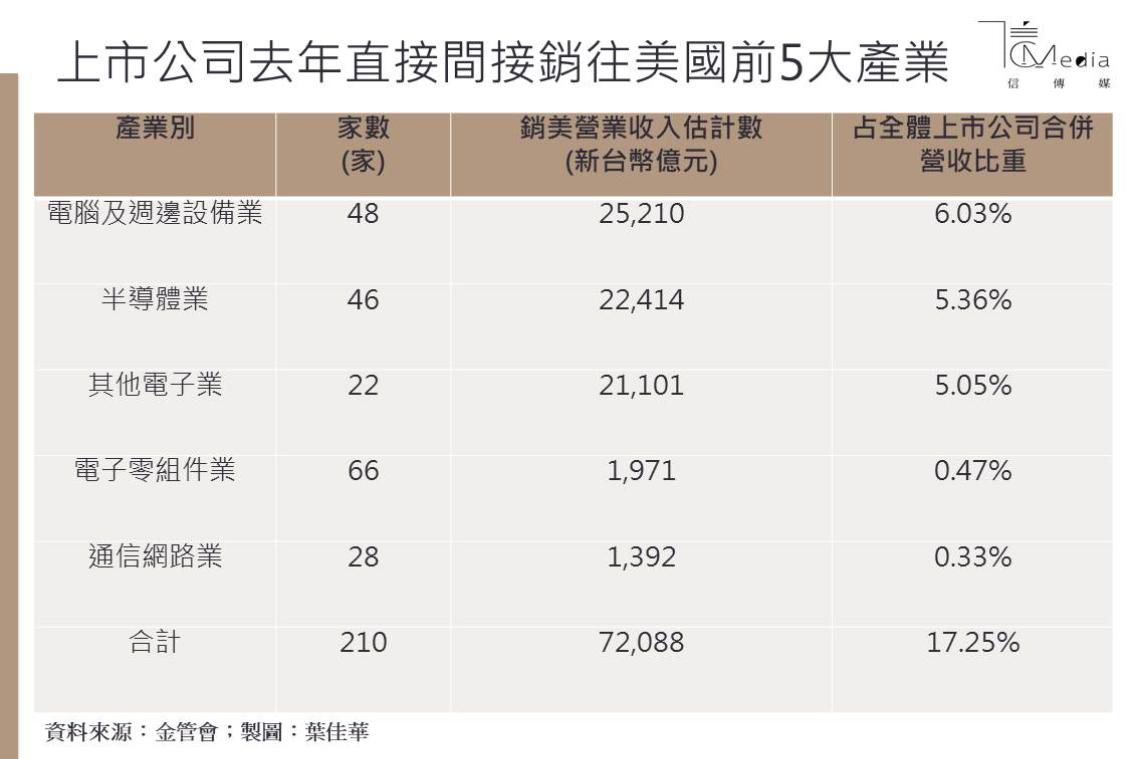若以產業別來看,上市公司主要前5大直接間接銷往美國的產業,包含電腦及周邊設備業、半導體業、其他電子業、電子零組件業、通訊網路業等共210家廠商,去(2024)年銷美營收估計數約為7.21兆元、占上市公司總營收的17.25%。