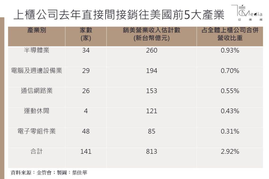 上櫃公司部分,上櫃公司前5大直接間接銷美產業,包含半導體業、電腦及周邊設備業、通訊網路業、運動休閒業、電子零組件業等141家廠商,去(2024)年銷美營收估813億元、占上櫃公司總營收達2.92%。