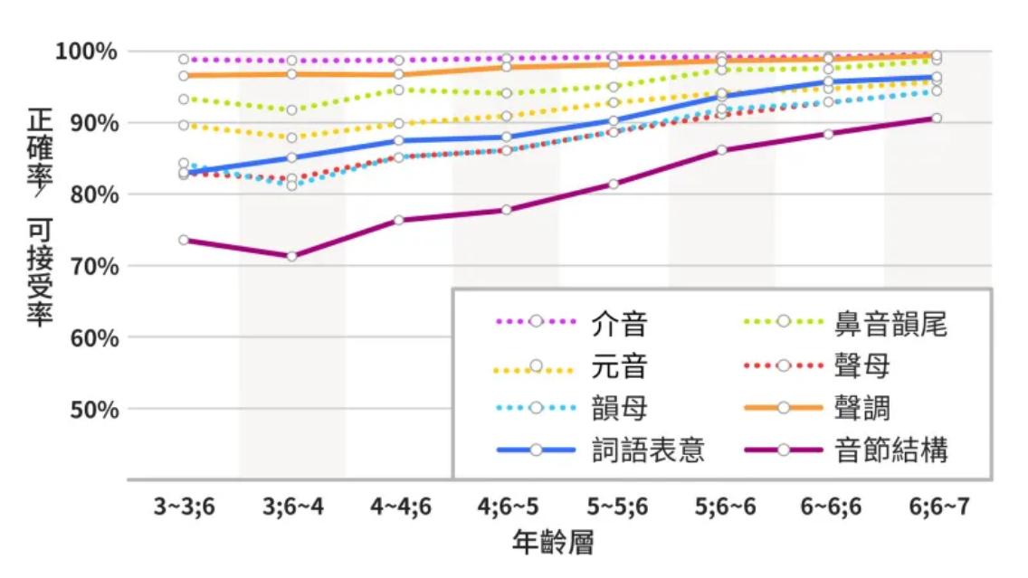 研究顯示,在「聲調」學習上,3 歲兒童的發音正確率已相當高;在「詞語表意」與「音節結構」方面,則觀察到明顯的年齡差異:從 3 歲至 6 歲,正確率隨著年齡穩步提升,形成一條清晰的學習曲線。