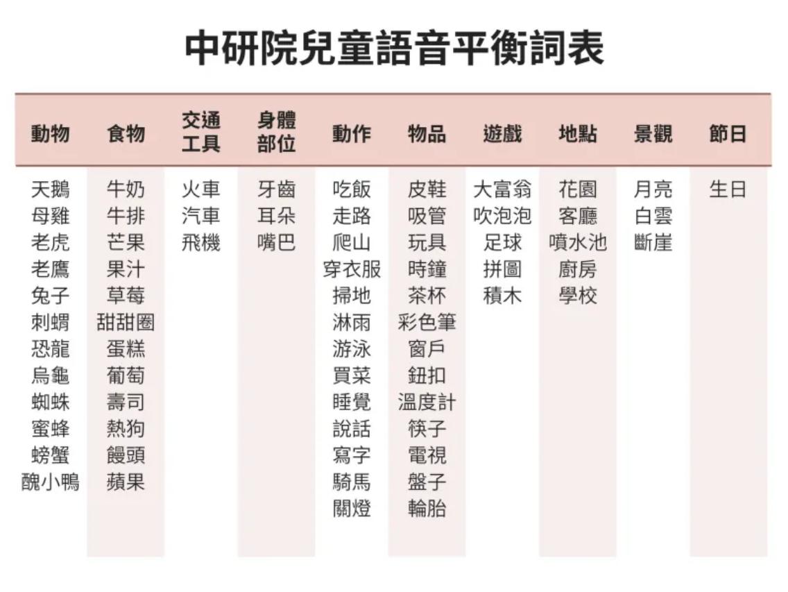 此外,詞彙的語意分布也經過精心挑選,儘量涵蓋不同的生活領域,讓詞表更符合幼兒的語言學習環境。這些詞彙的巧妙設計,也用於進行中的兒童語音收集計畫。