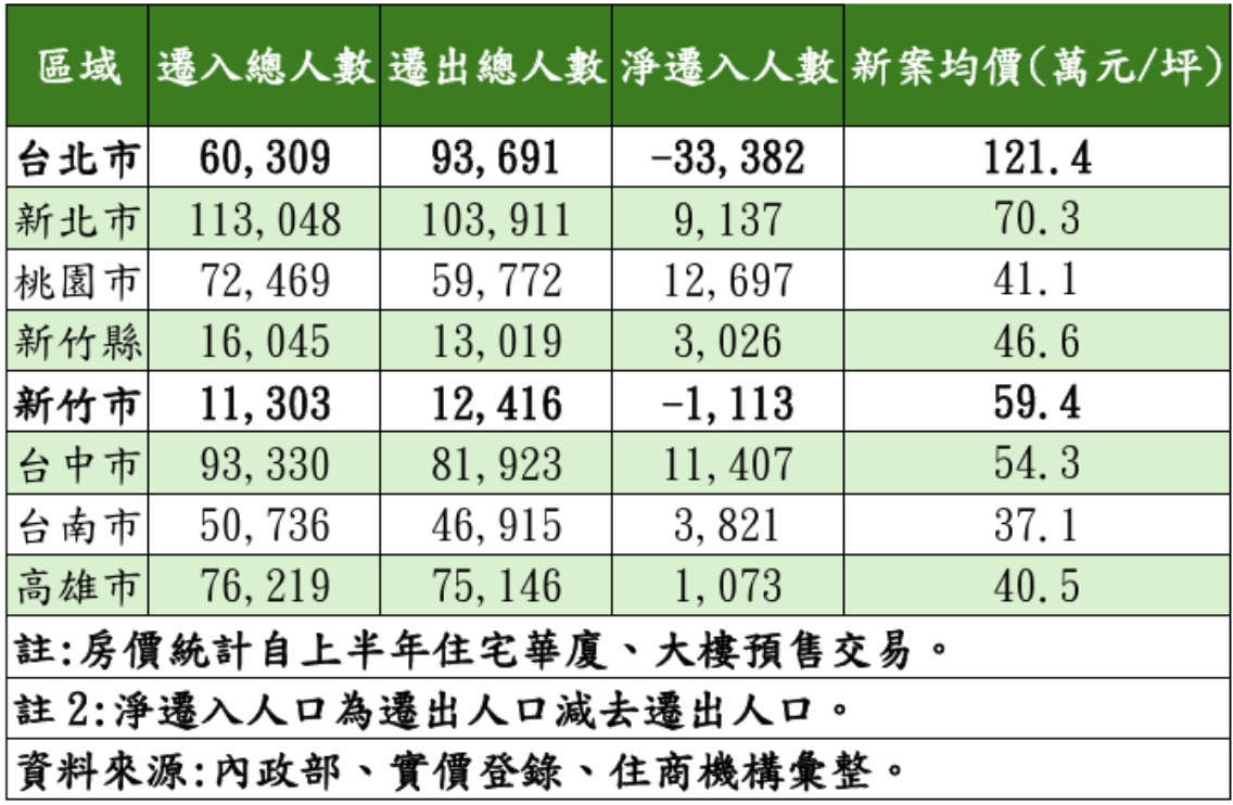 內政部統計顯示,台北市今年上半年共遷出9.3萬人,但僅約6萬人遷入,整體淨遷出人口共達3.3萬名,為全台各縣市中,淨遷出人口最多的縣市。賴志昶指出,細看台北市資料,約3.6萬名北市遷出人口是移往新北市、約7千人移往桃園市,顯示在新北捷運、桃園機場捷運等交通建設串聯下,加上政府日前推出「TPASS政院通勤月票」等政策,加速北市人口遷移速度;另外,北市上半年平均新案房價已達每坪121.4萬元,房價之高有目共睹,剛需族群負擔不起如此高昂價位,僅能往外縣市移動。
