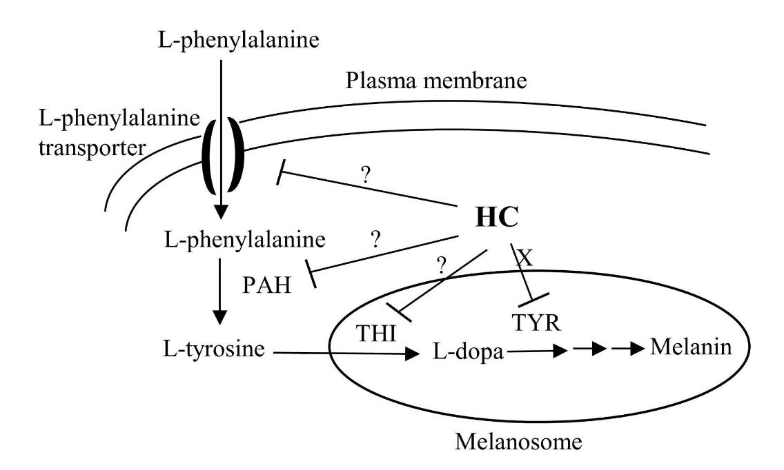 張德生教授推論,HC 有可能是透過抑制黑色素生成的前驅物酪胺酸,或更早一步的酪胺酸前驅物——苯丙胺酸(Phenylalanine)[註三],阻止他們進入細胞中,來達到抑制黑色素生成的效果,唯這個猜想還需要更多試驗才能得到驗證。
