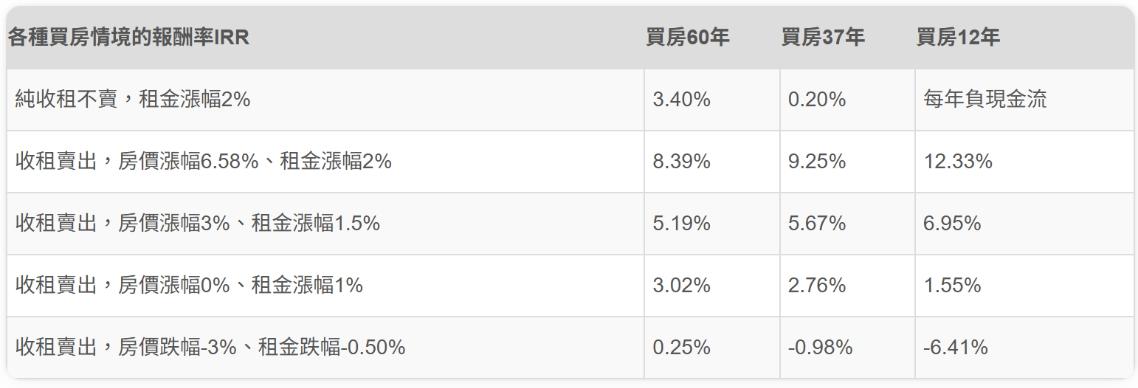 (註三)財務模型假設:未來房價年化漲幅6.58%、總價3,000萬房屋、貸款七成自備款三成、利率2.2%、貸款年限30年、裝潢及交易仲介稅費等一次性支出200萬、首年租金報酬率3%、租金漲幅2%、每二年空置一個月找租客、房仲委託價金一個月房租及代管費房租10%、每年修繕費一萬及漲幅3%、及現行最低的自住房屋稅地價稅等